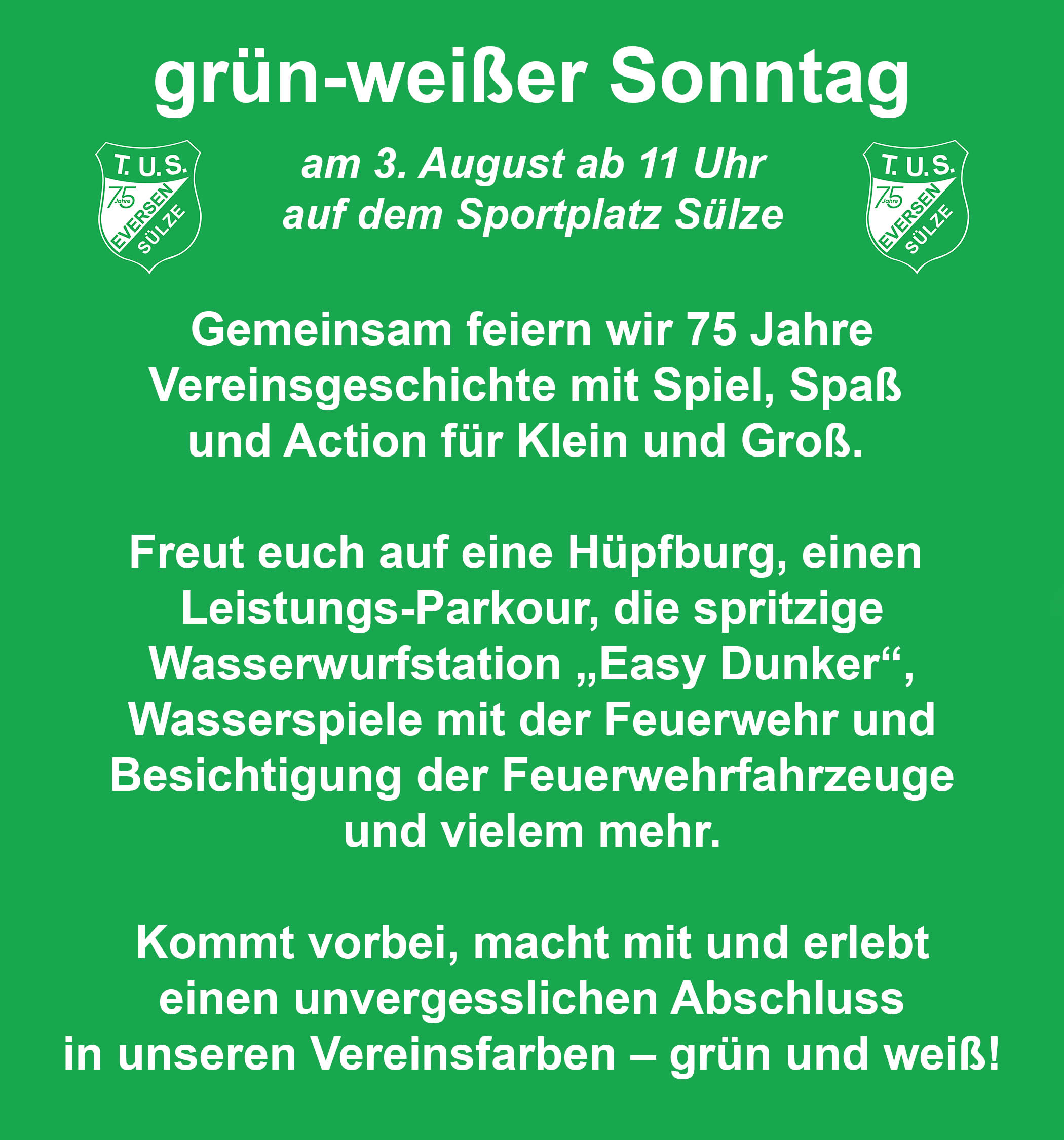 Anlässlich unseres 75-jährigen Vereinsjubiläums richten wir am 3. August den "grün-weißen Sonntag" aus.