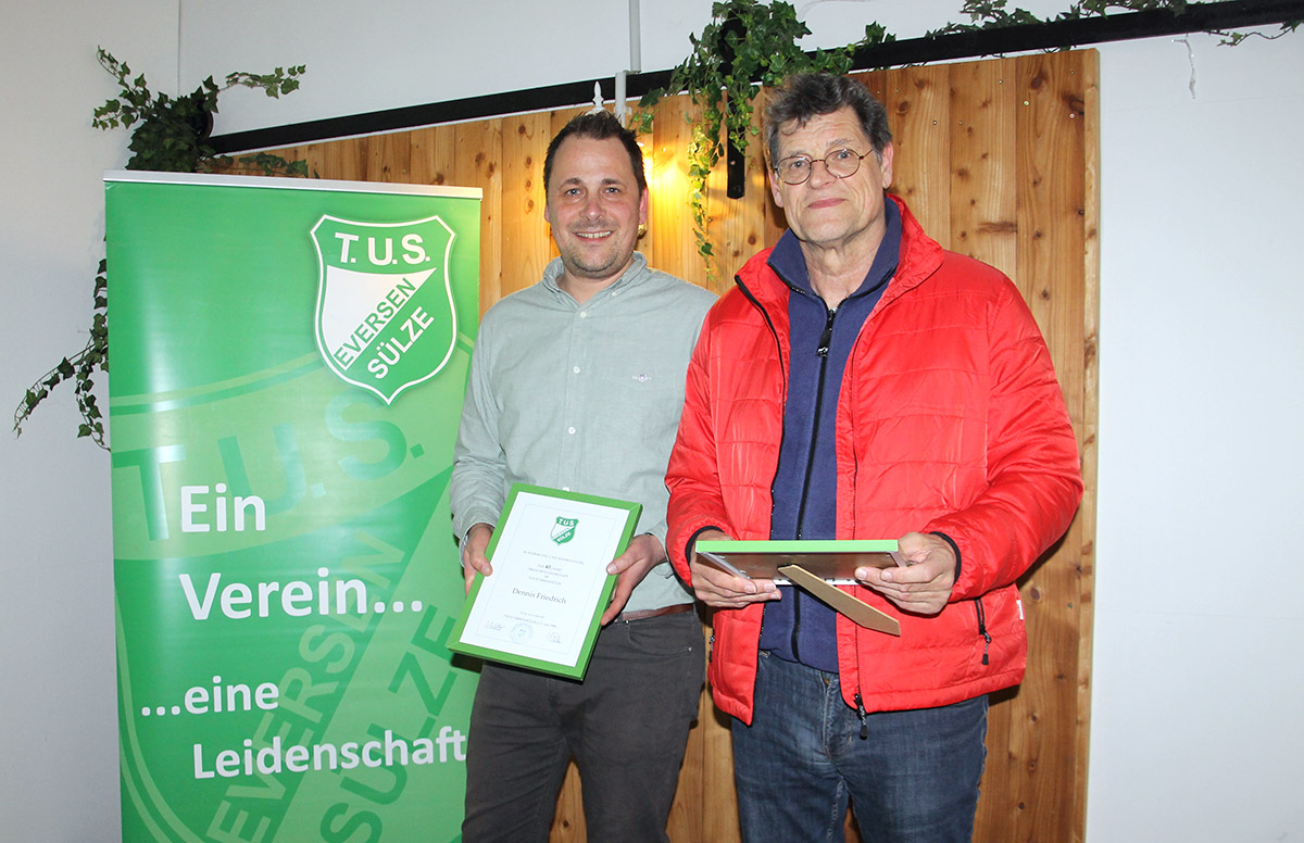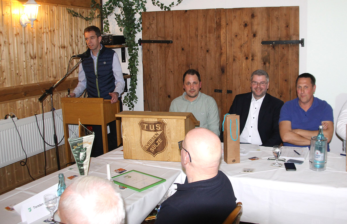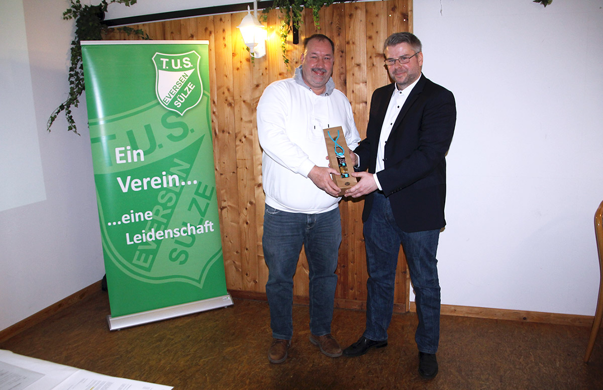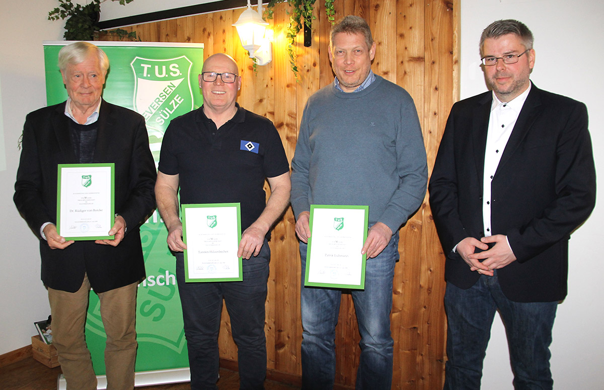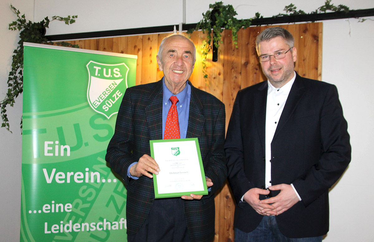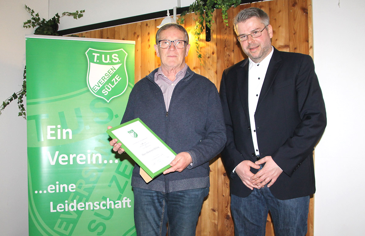 Die Verbundenheit der Mitglieder zum TuS Eversen/Sülze wurde bei den Ehrungen für langjährige Mitgliedschaft deutlich: Manfred Gegner und Heini Meyer können auf 75 Jahre zurückblicken, Helmut Lessen auf 70 Jahre, Hans Hermann Ehling und Wilfried Sälzer auf 65 Jahre und Dr. Rüdiger von Borcke, Torsten Hilzenbecher und Patrik Luhmann auf 50 Jahre. Weiterhin halten Hardy Braun und Dennis Friedrich dem Verein seit 40 Jahren die Treue sowie Andreas Marks, Jan-Frederik Otte und Friedhelm Schmidt seit 25 Jahren.