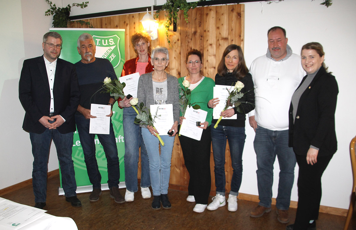 Der Vorsitzende Klaus Schröter hob in seinem Bericht zur Vereinsarbeit hervor, dass der TuS auf eine lange Tradition zurückblicken kann und auch aktuell voller Leben steckt. Sportlich läuft es in allen Sparten gut, was man besonders im Fußball und Dart durch sehr gute Ergebnisse in ihren jeweiligen Ligen miterleben kann. Aber auch die anderen Sparten zeichnen sich durch vielfältige Sportangebote, engagierte Trainer und Betreuer sowie durch viele motivierte junge und ältere Sportler aus. Hervorzuheben ist dieses Jahr unsere Turnsparte. Hier wurden Dagmar Japp, Claudia Kauschka, Annika Huget, Carola Bartholomäus und Horst Hausmann durch Jessica Hubach (TuS E/S Spartenleiterin Turnen und NTB Turnkreis Celle Vorstand Bildung) für langjährige ehrenamtliche und verdienstvolle Trainer und Betreuertätigkeiten mit der NTB Kreisehrennadel ausgezeichnet.