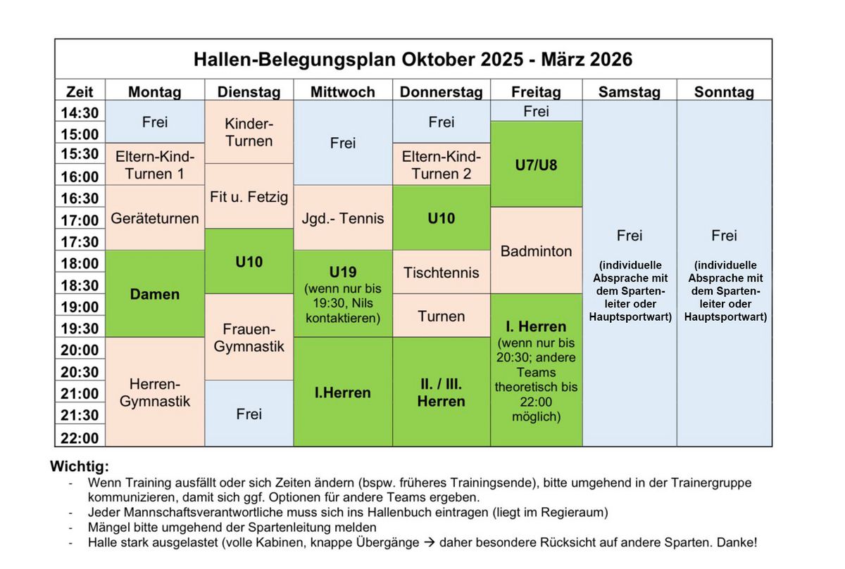 Übersicht der aktuell gültigen Trainingszeiten der Turner Sparte